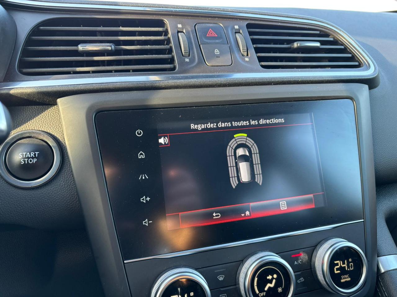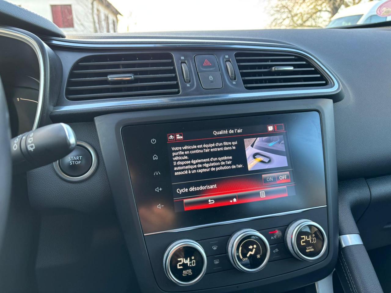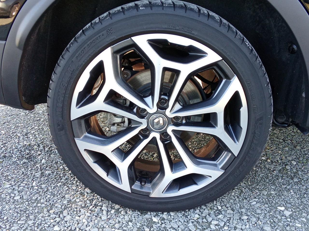 Équipements principaux : sellerie cuir/TEP, R-Link 2 avec navigation et écran tactile 7", compatibilité Android Auto / Apple CarPlay, climatisation automatique bi‑zone, régulateur/limiteur de vitesse, volant cuir, jantes alliage 19" Egeus, projecteurs AV full LED Pure Vision, caméra de recul, aides au parking AV/AR/latéral, freins assistés (ABS + aide au freinage d'urgence), contrôle électronique de stabilité (ESC/ASR), surveillance de la pression des pneus, barres de toit, vitres et lunette arrière surteintées.
