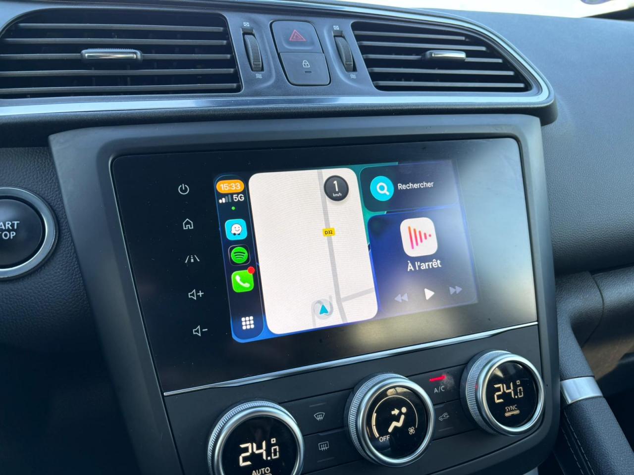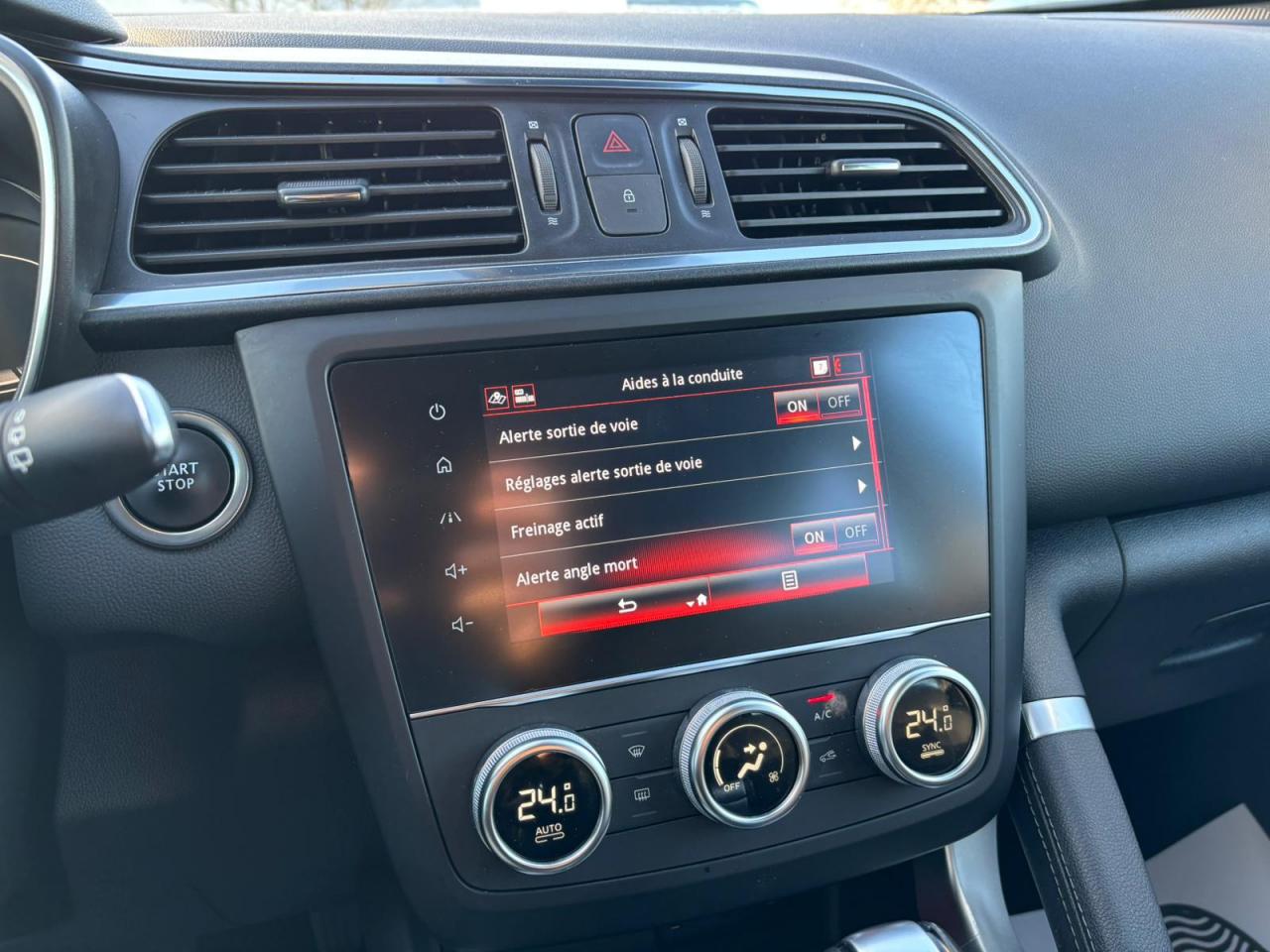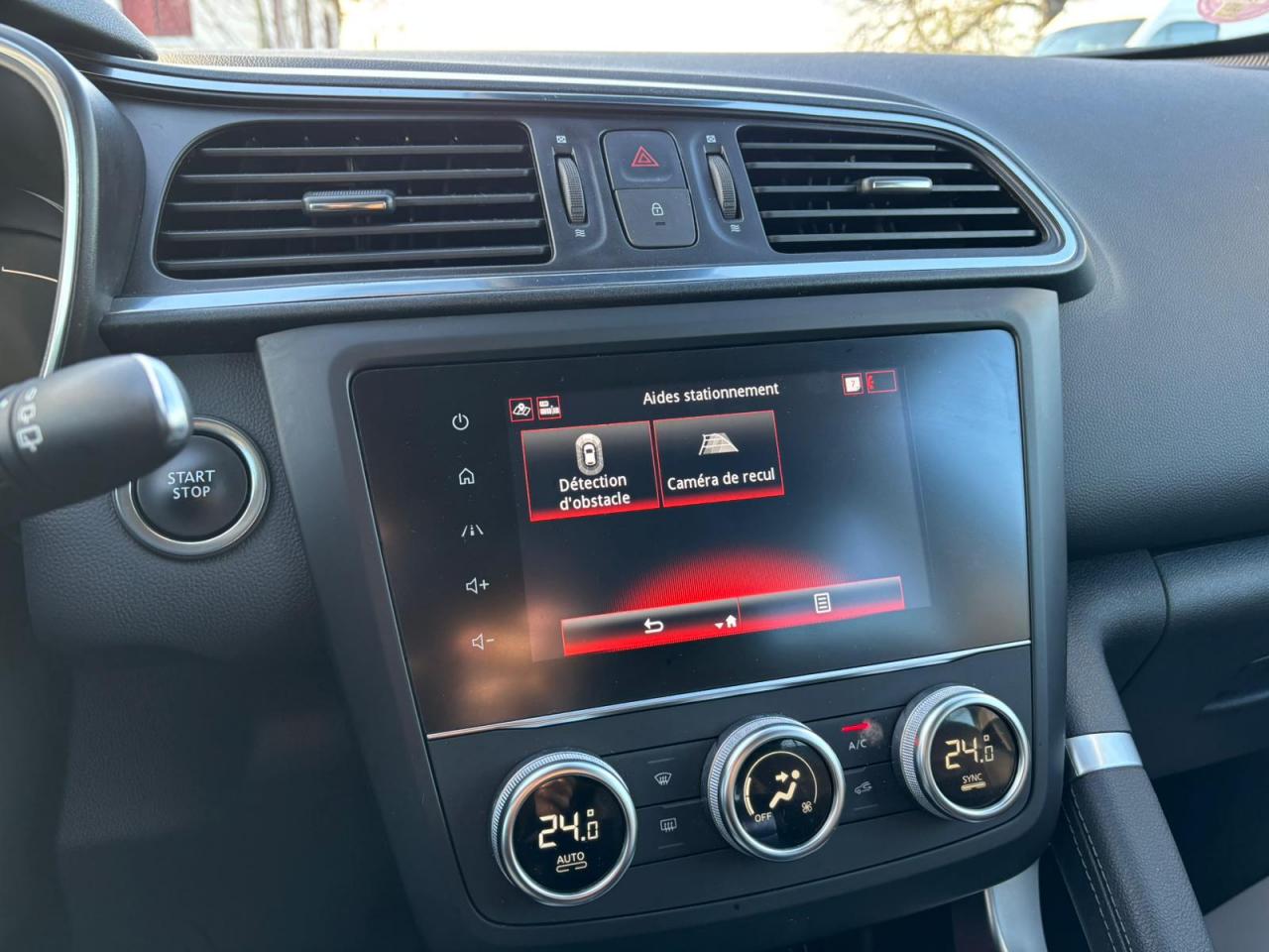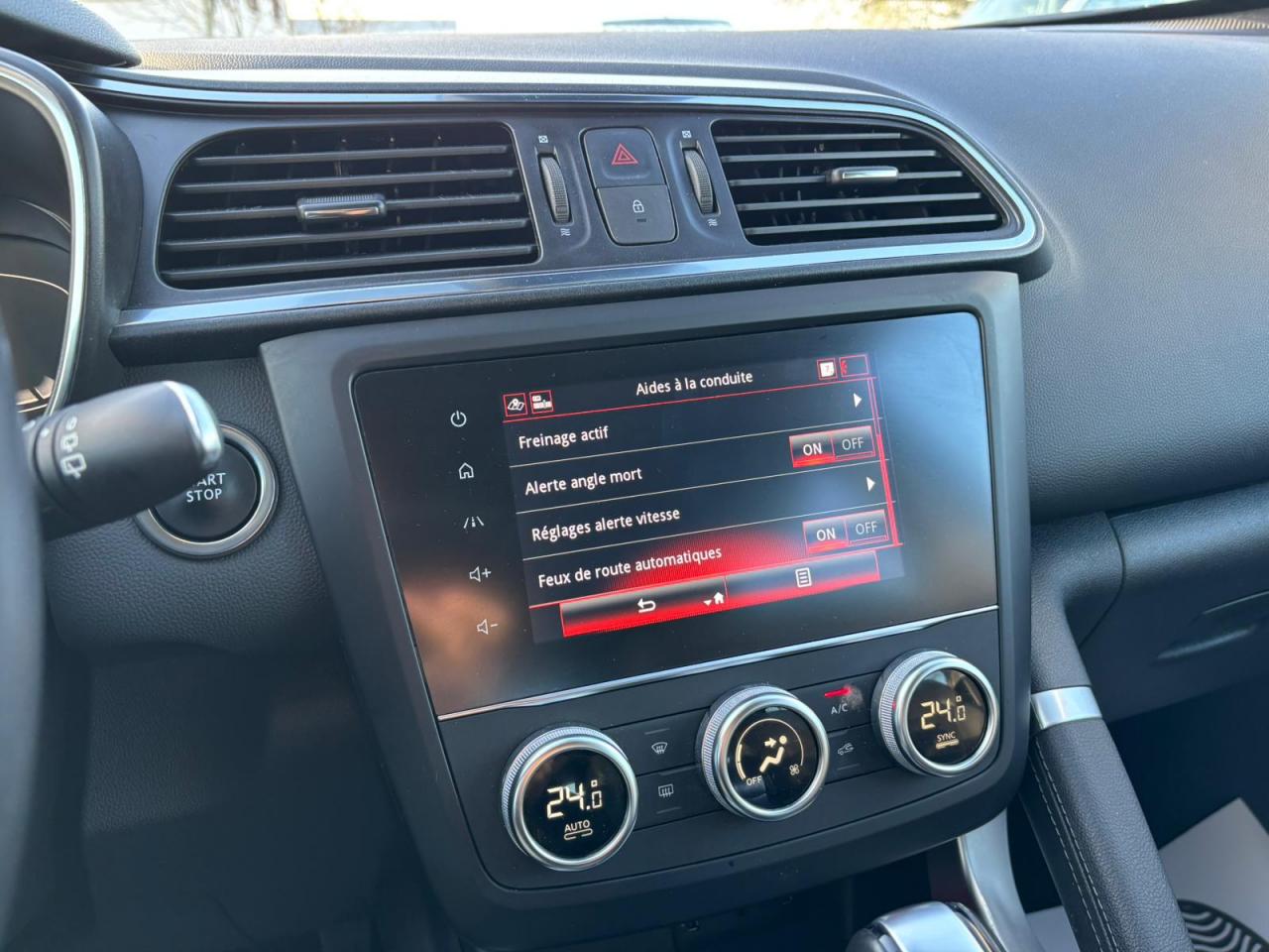 Équipements principaux : sellerie cuir/TEP, R-Link 2 avec navigation et écran tactile 7", compatibilité Android Auto / Apple CarPlay, climatisation automatique bi‑zone, régulateur/limiteur de vitesse, volant cuir, jantes alliage 19" Egeus, projecteurs AV full LED Pure Vision, caméra de recul, aides au parking AV/AR/latéral, freins assistés (ABS + aide au freinage d'urgence), contrôle électronique de stabilité (ESC/ASR), surveillance de la pression des pneus, barres de toit, vitres et lunette arrière surteintées.